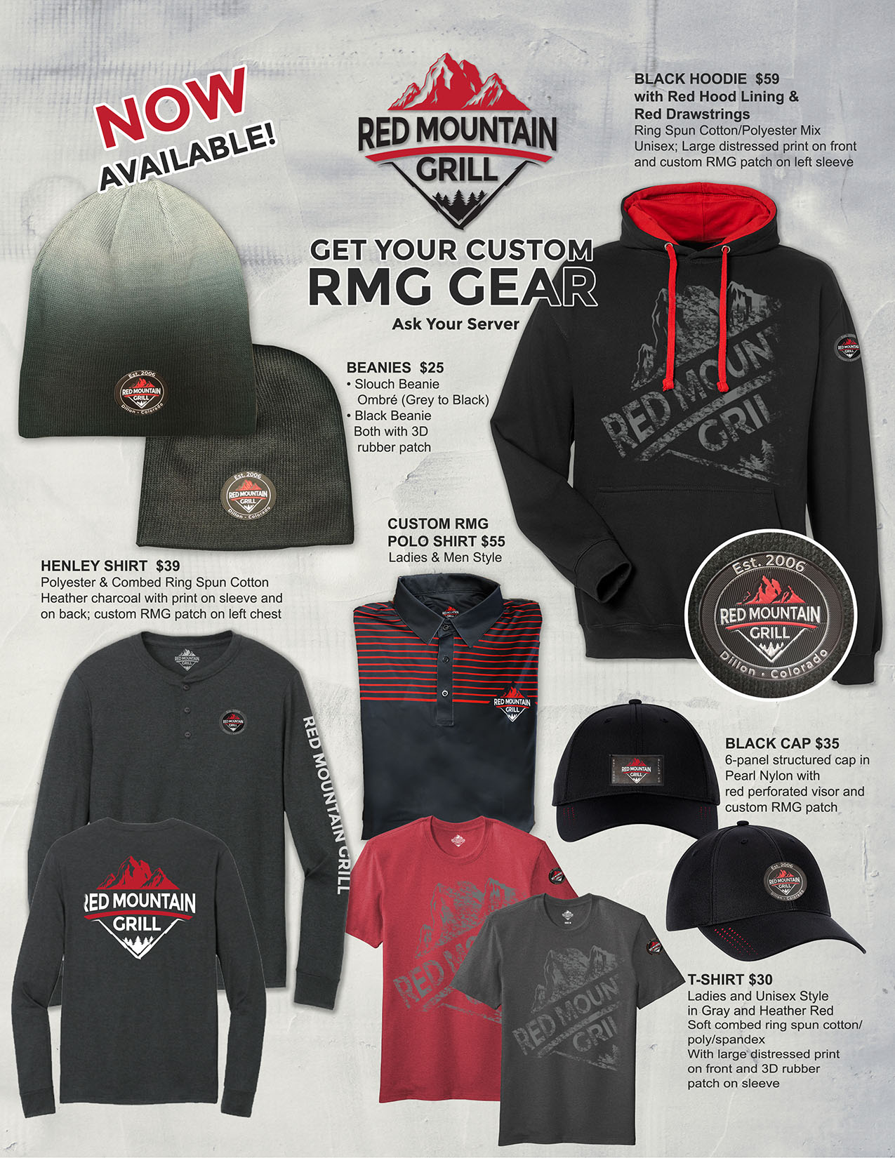 Red Mountain Grill offers a nice selection of custom branded apparel and merchandise. Please ask your server to show you the below items, and if you wish to take a piece of Red Mountain Grill home with you. We put a lot of thought and design time to create some very trendy apparel items.
