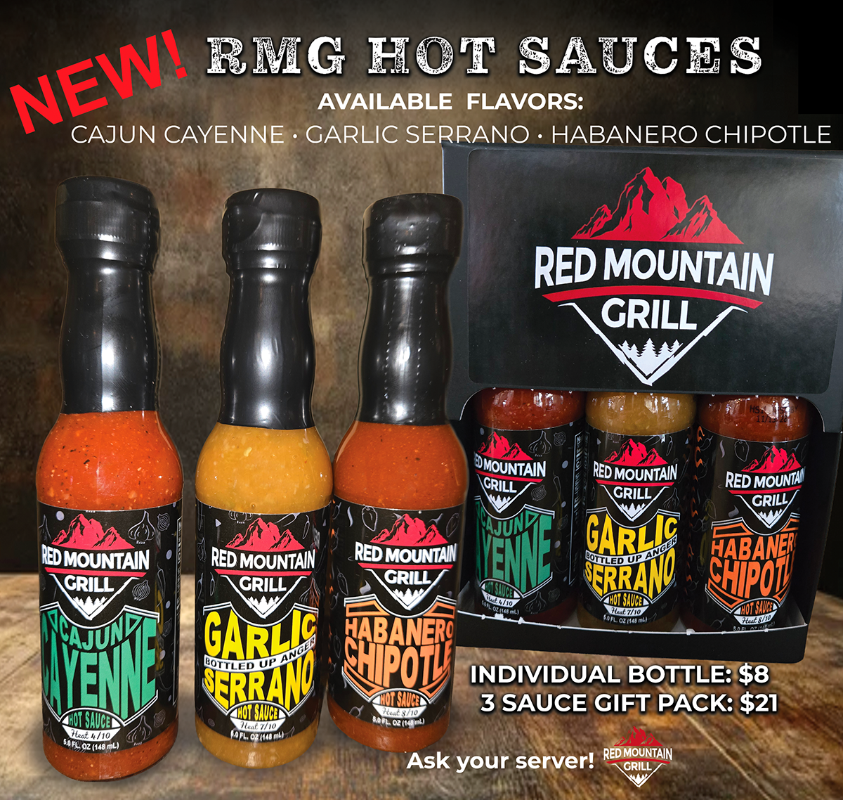 A great take home gift! Select one or all of our delicious RMG Hot Sauces. Chose from flavors, such as Cajun Cayenne, Garlic Serrano and Habañero Chipotle. Please ask your server. Select the 3-Sauce Gift Pack for $21 or individual bottles for $8 each.